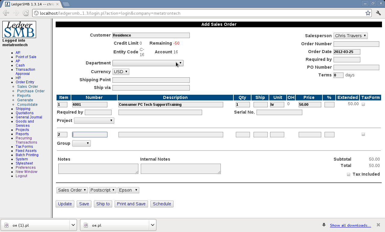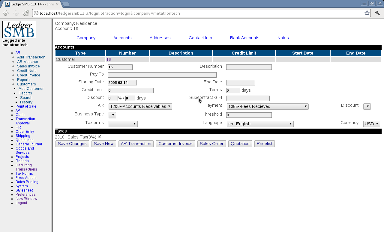 2) The contact management section is redone. Customers/vendors can now have multiple accounts, contact information, shipping and billing info, notes, etc. This screen shot shows how this looks with Javascript enabled. Here Javascript is used to clean up the interface, and the links at the top switch between visible divs.