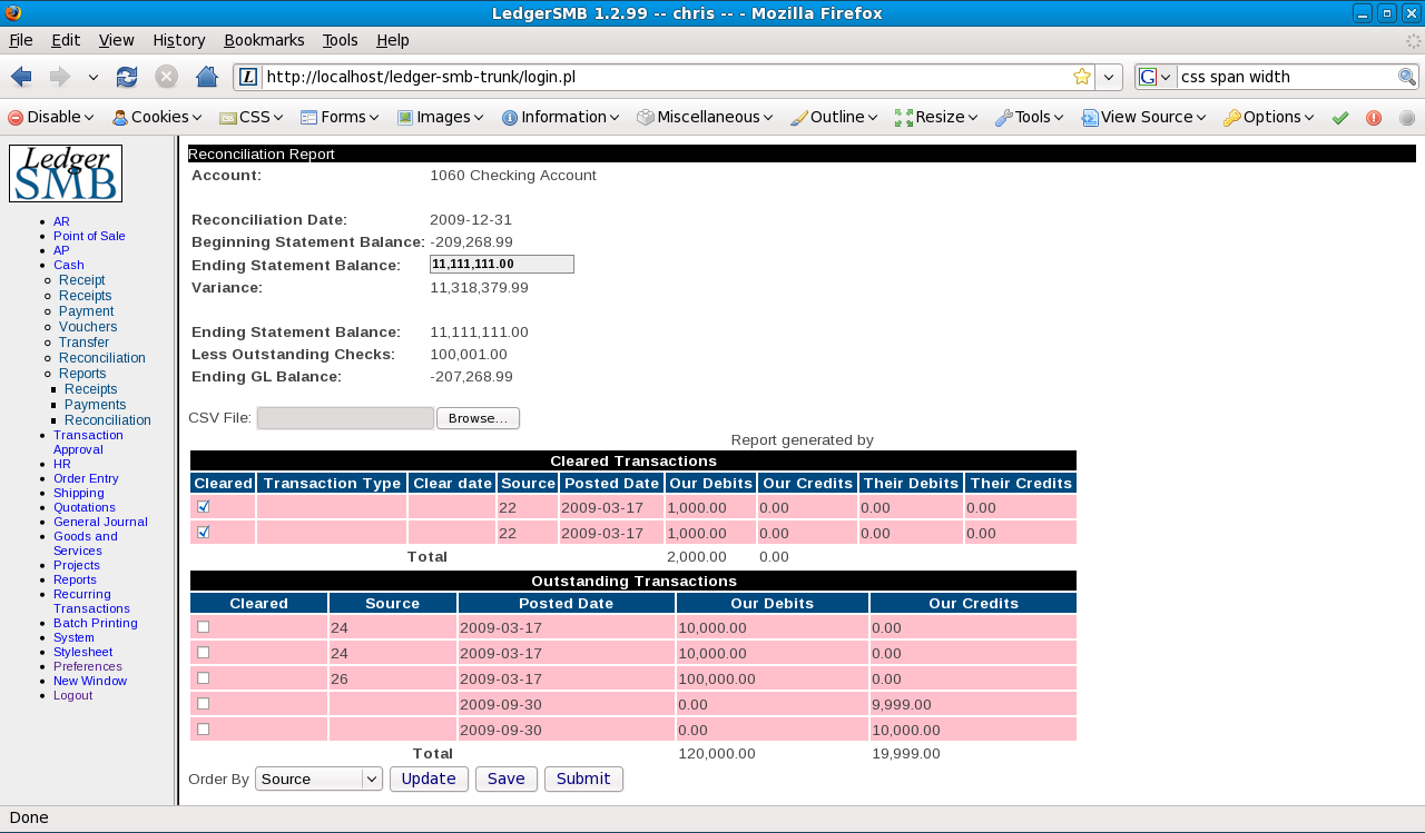 1) Bank Reconciliation has been entirely redesigned in 1.3 with a new workflow and it is better designed to handle large numbers of transactions. Additionally you can go back later and review a reconciliation set to see what cleared and what was outstanding. This screen shot shows a report for a work in progress.